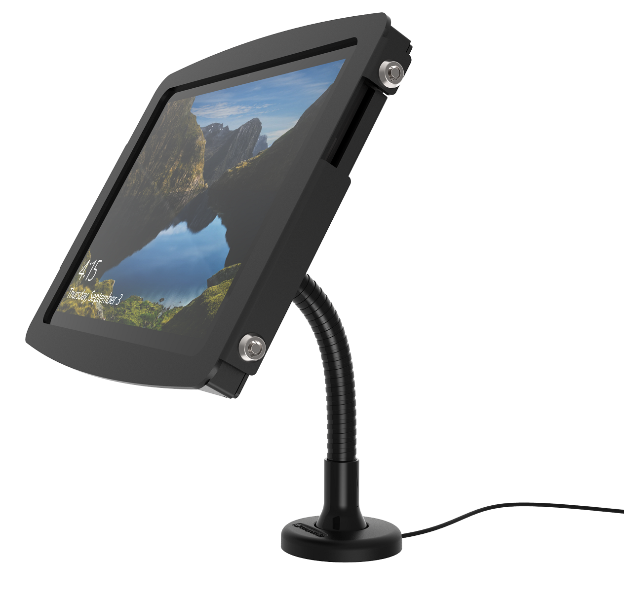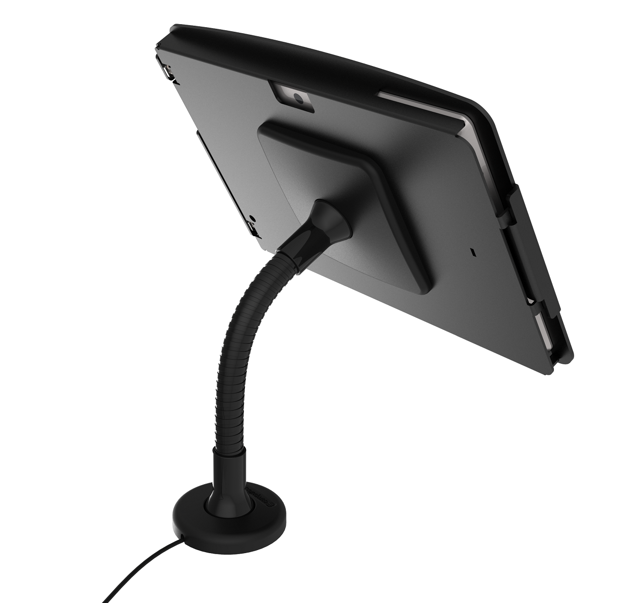 Our Flex Arm stand can be mounted on any flat surface, counter-top or to a wall for use as a secure interactive display or kiosk with a bendable arm that is great for corners and where counter space is limited. Limited cable management is available through the mount and arm of the stand (suitable for Lightning cable or up to Ø 10 mm cable extensions) and there is an adhesive no-screw base add-on available.