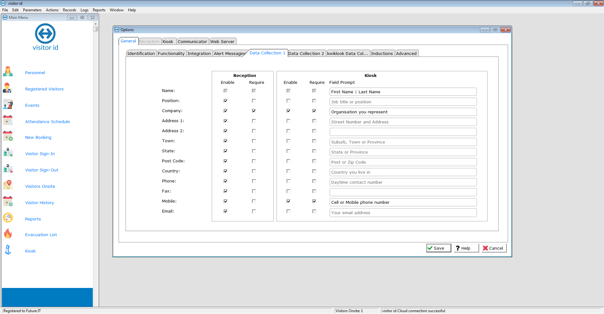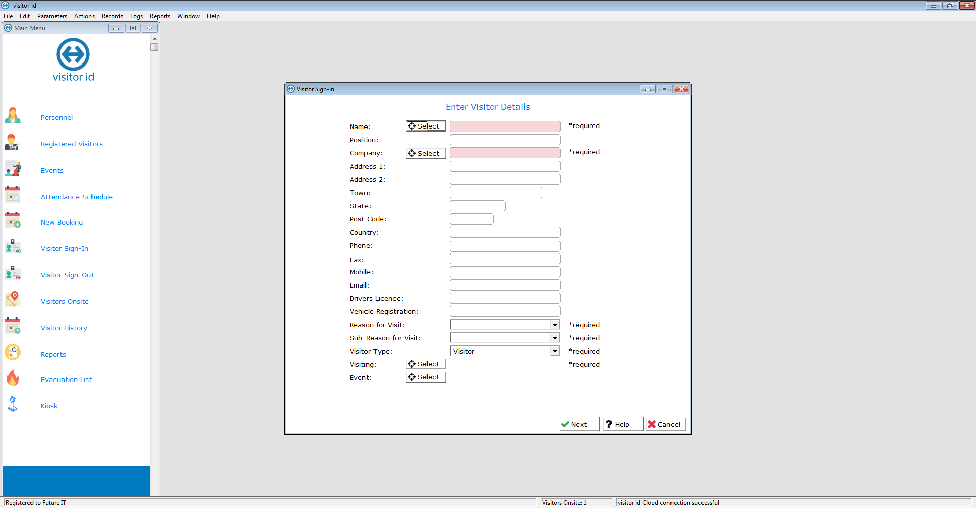 The smart visitor management solution. visitor id Basic includes up to 50 visitors per day, webcam and pass printer support, email and SMS alerts plus the evacuation list report. 1 client install per subscription.