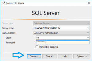 - Connect to the visitor id instance. Use the ‘sa’ login and password as described in the article Installing Microsoft SQL Server Manually.