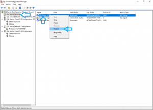 - Right click the ‘SQL Server Browser’ item in the right-pane and click the ‘Restart’ menu item: