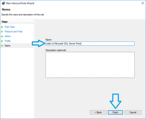 - On the ‘Name’ screen, type ‘visitor id Microsoft SQL Server Ports’ in the ‘Name’ field, then click the ‘Finish’ button: