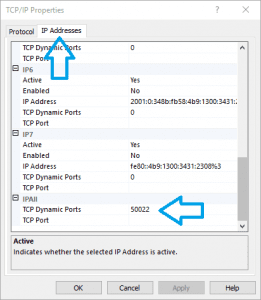 - In the ‘TCP/IP Properties’ window Click the ‘IP Addresses’ tab and scroll to the bottom of the list. Make a note of the ‘IPAll > TCP Dynamic Ports’ value: