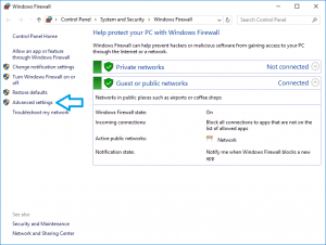 - In the ‘Windows Firewall’ window click the ‘Advanced Settings’ item in the left-pane: