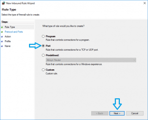 - In the ‘New Inbound Rule Wizard’ window ‘Rule Type’ screen, choose the ‘Port’ option then click the ‘Next >’ button: