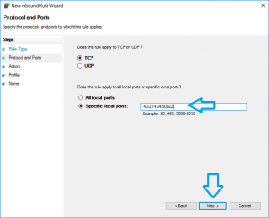 - On the ‘Protocol and Ports’ screen, enter the default Microsoft SQL Server ports as well as the Dynamic Port as noted in step 2 with commas in-between each value as in this image, then click the ‘Next >’ button: