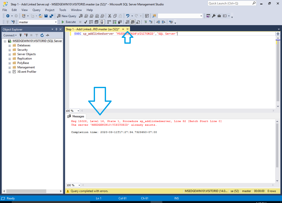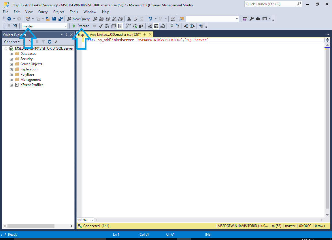 - Open the ‘Step 1 – Add Linked Server.sql’ file in Microsoft SQL Server Management Studio.