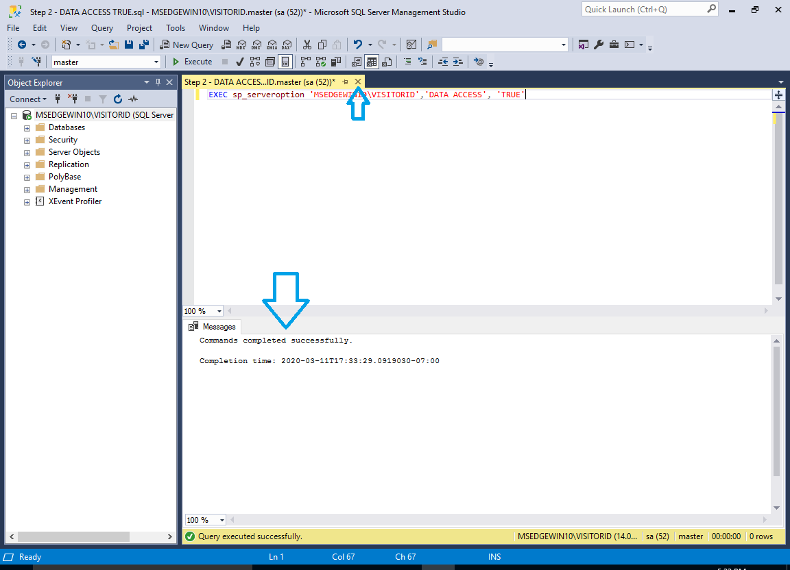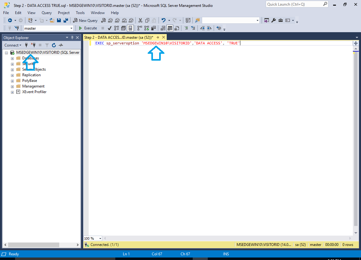 - Open the ‘Step 2 – DATA ACCESS TRUE.sql’ file in Microsoft SQL Server Management Studio. You may be asked to connect to the SQL Server Instance again.