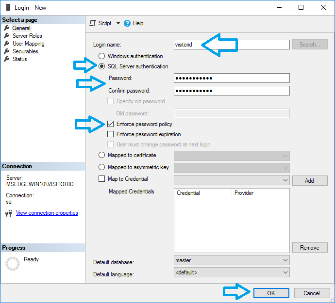 It is highly recommended to create a new SQL Server Login for the visitor id database to use to connect to the visitor id database.