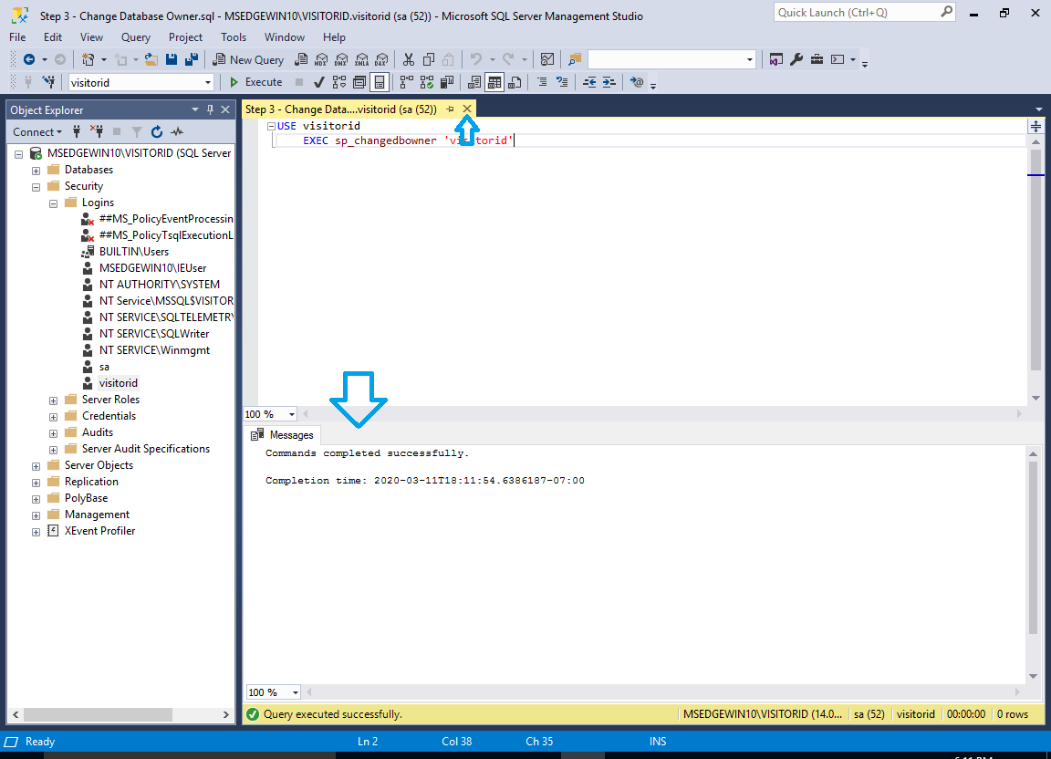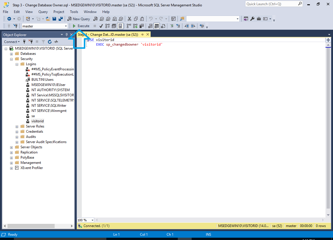 - Open the ‘Step 3 – Change Database Owner.sql’ file in Microsoft SQL Server Management Studio.