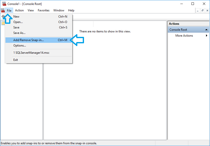 - In the ‘Management Console’ window, click the ‘File > Add/Remove Snap-in…’ menu item: