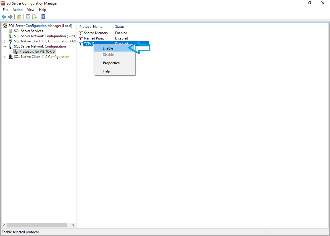 - Right click the ‘TCP/IP’ item in the right-pane and click the ‘Enable’ menu item. Click ‘OK’ on the warning message that appears: