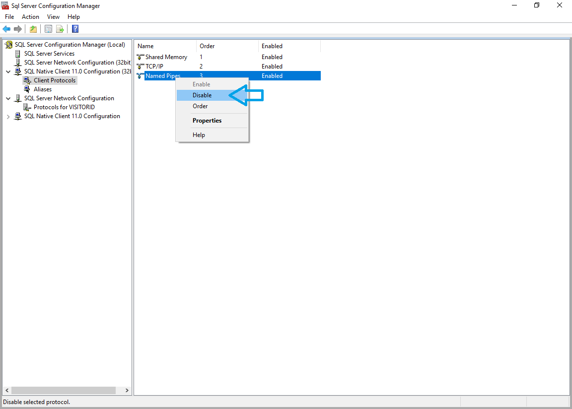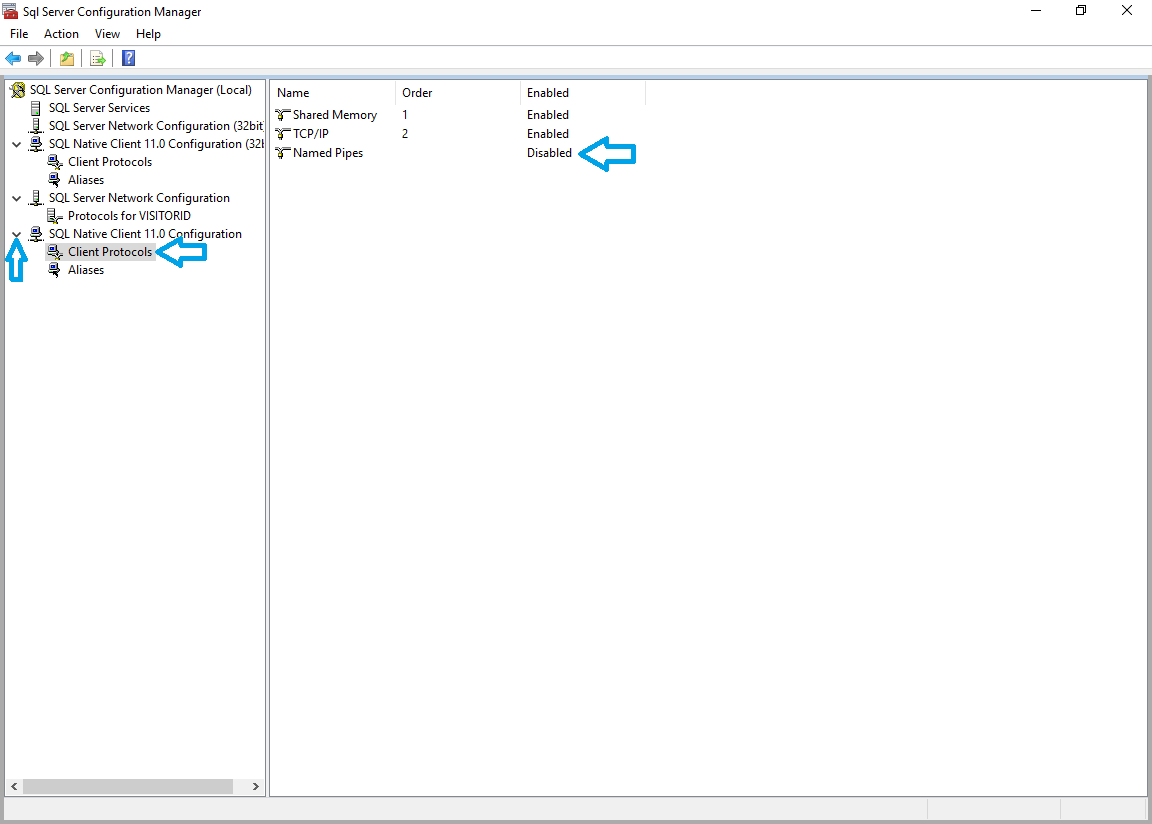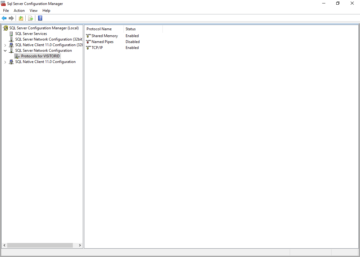 - Expand the ‘SQL Server Network Configuration’ node, then click the ‘Protocols for VISITORID’ item: