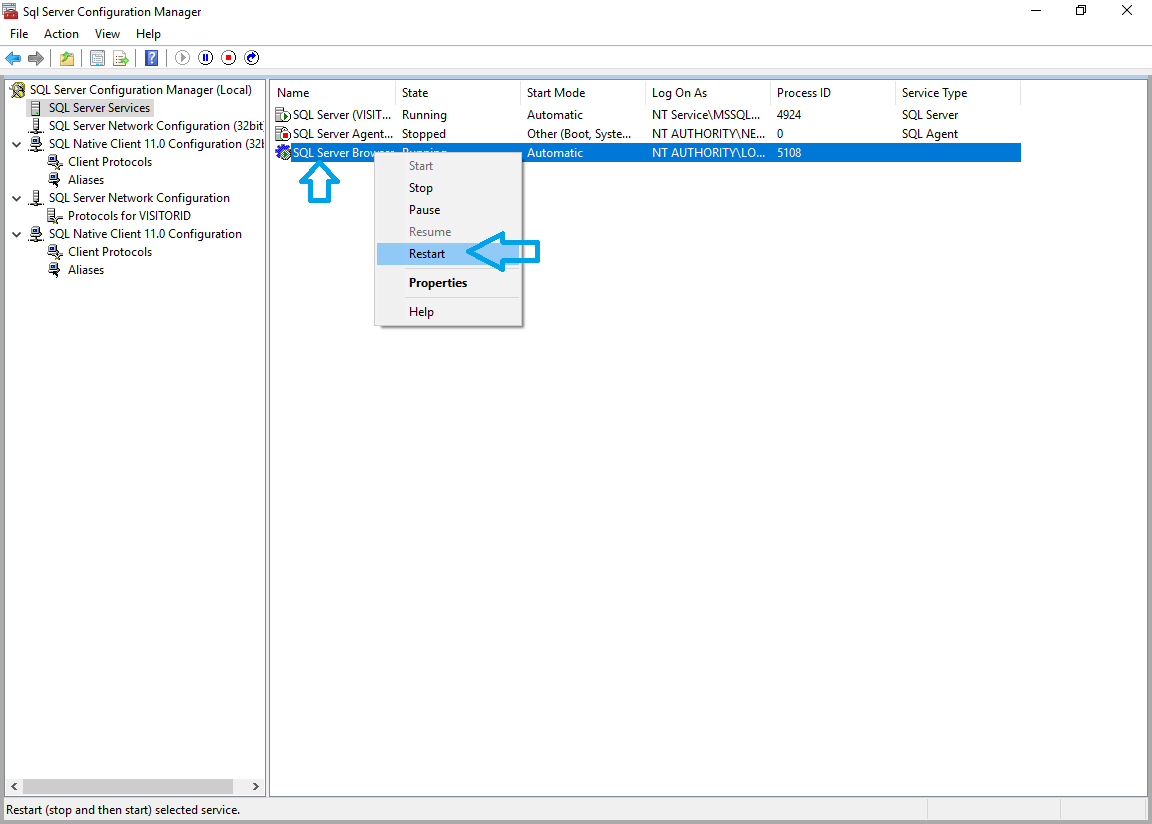 - Right click the ‘SQL Server Browser’ item in the right-pane and click the ‘Restart’ menu item: