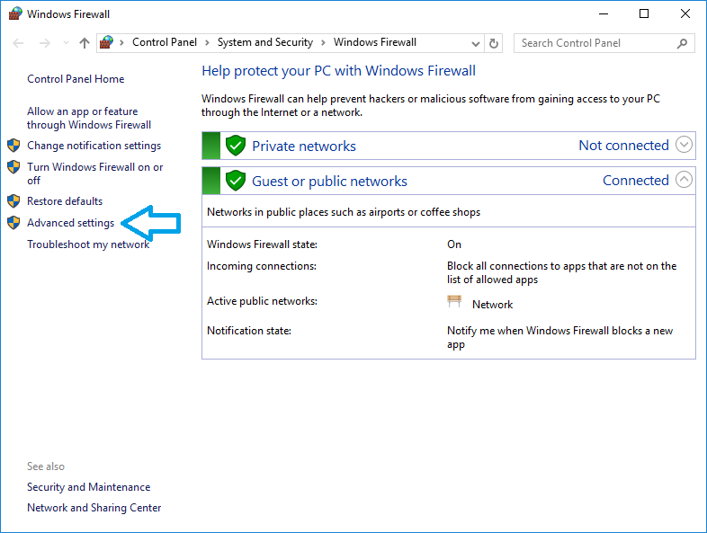 - In the ‘Windows Firewall’ window click the ‘Advanced Settings’ item in the left-pane: