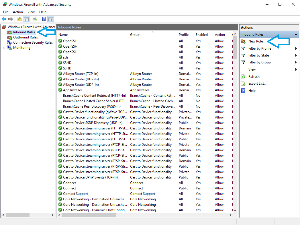 - In the ‘Windows Firewall with Advanced Security’ window click the ‘Inbound Rules’ item in the left-pane, then click the ‘New Rule…’ item in the right-pane: