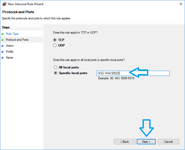 - On the ‘Protocol and Ports’ screen, enter the default Microsoft SQL Server ports as well as the Dynamic Port as noted in step 2 with commas in-between each value as in this image, then click the ‘Next >’ button: