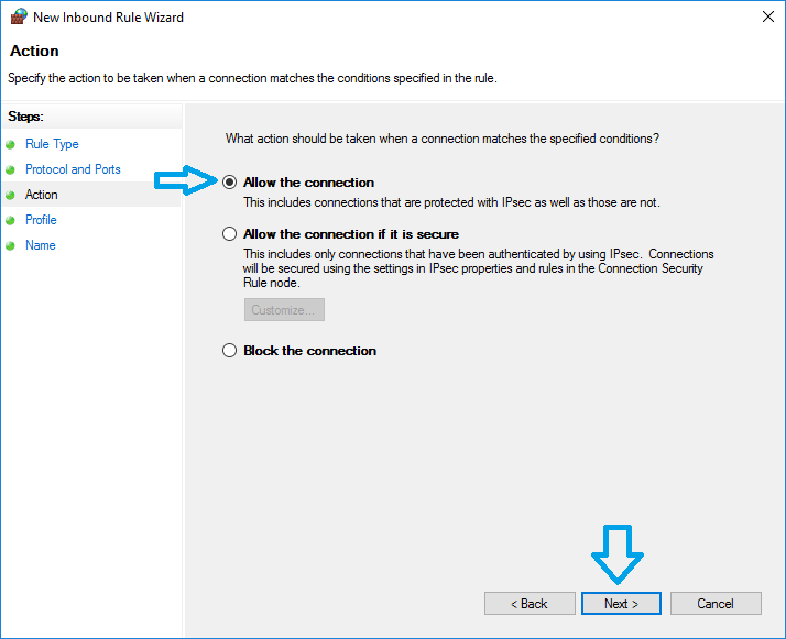 - On the ‘Action’ screen, make sure the ‘Allow the connection’ option is selected then click the ‘Next >’ button: