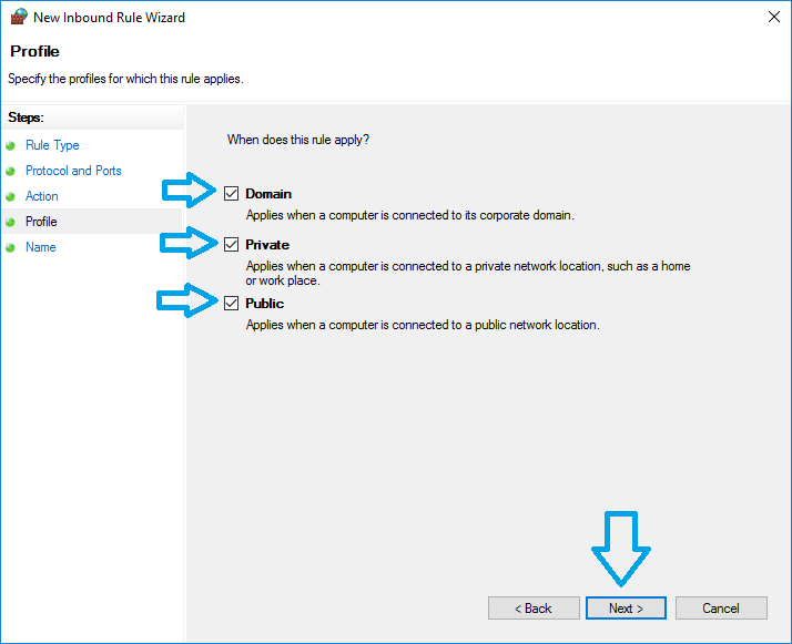 - On the ‘Profile’ screen, make sure all three checkboxes are ticked then click the ‘Next >’ button: