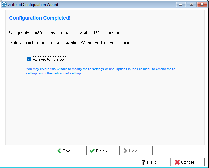 - Congratulations! The Master Configuration Wizard is now complete. Click the ‘Finish’ button to restart visitor id with your chosen options: