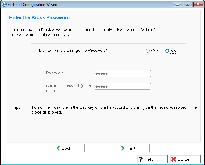 - In the ‘Enter the Kiosk Password’ window, the password to exit the kiosk is set here. The default password is ‘admin’. We highly recommend you change this password and record the new password in your organisation’s password management system. Click the ‘Next’ button to continue: