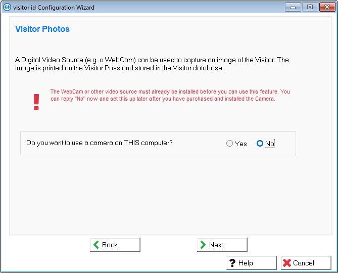 - In the ‘Visitor Photos’ window, choose whether you will be using a Web Camera to capture visitor photos during the sign-in process. The web camera can be setup at a later time if the web camera is not currently installed. If choosing ‘No’ then skip to step 11 below. Press the ‘Next’ button to continue: