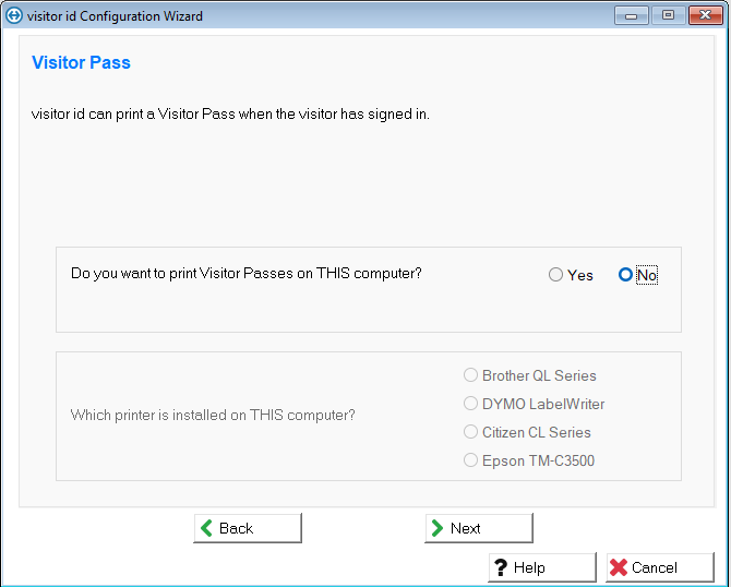 - In the ‘Visitor Pass’ window, choose whether you will be using a pass printer to print visitor labels. The pass printer must be already installed on the PC. This step can be skipped and setup later if the pass printer is not currently installed on the PC. If choosing ‘No’ then skip to step 13 below. If choosing ‘Yes’ then also choose the brand of pass printer that is installed. Click the ‘Next’ button to continue: