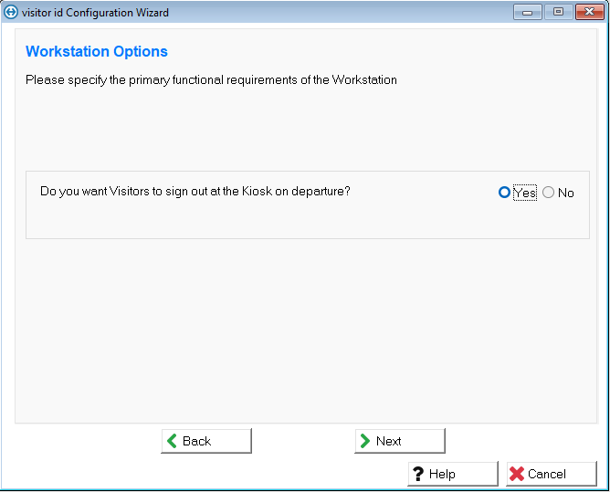 - In the ‘Workstation Options’ window, choose whether you want your visitors to be able to sign-out from this kiosk. If the ‘No’ option is chosen then only the ‘Sign-In’ button will be available for your visitors in ‘Kiosk’ mode. Click the ‘Next’ button to continue: